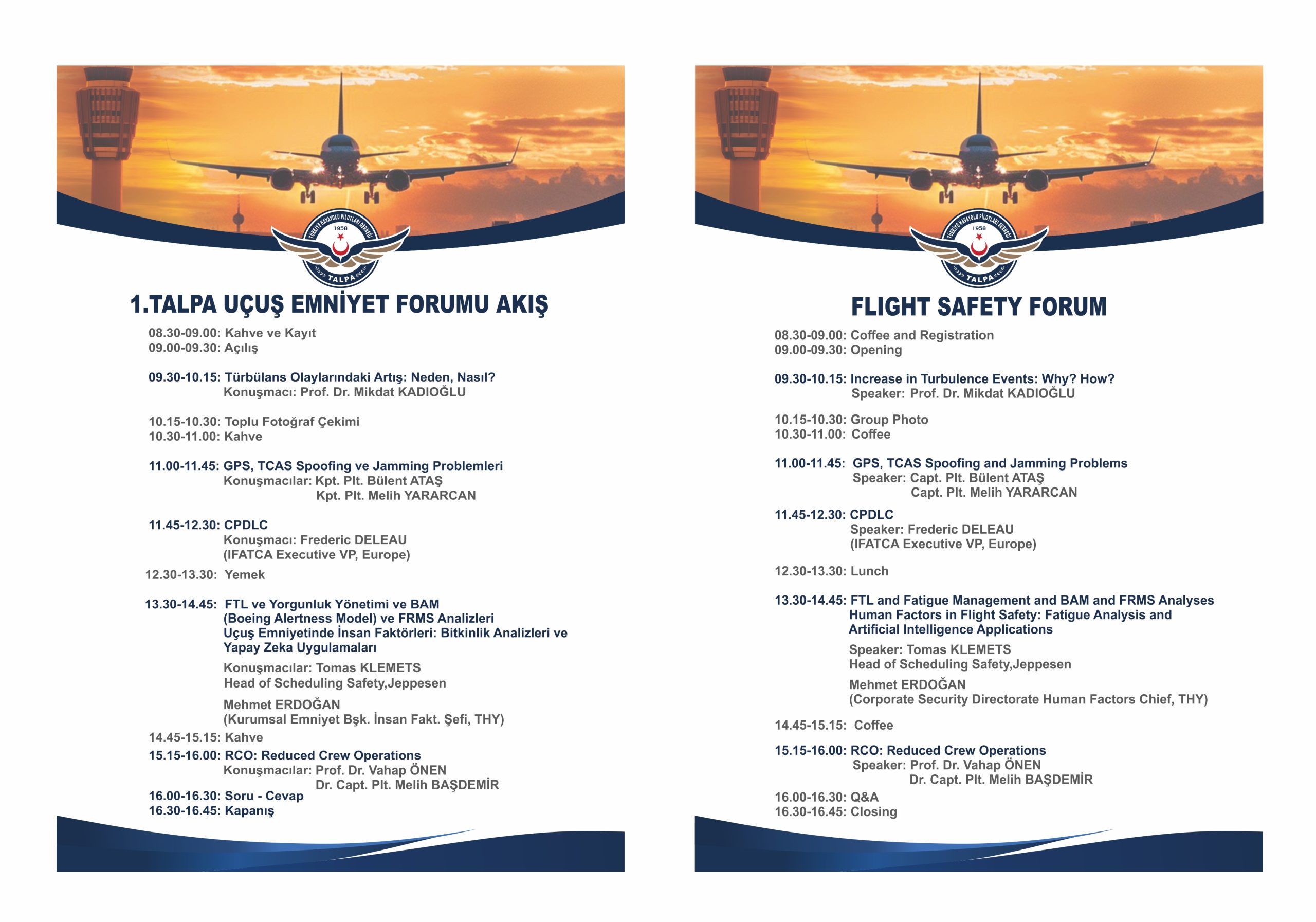 17-18 Kasım tarihlerinde, TALPA öncülüğünde Sivil Havacılık Akademisi’nde gerçekleştirilecek olan, uçuş emniyetine dair güncel gelişmelerin, sektörel risklerin ve çözüm önerilerinin alanında uzman isimlerle ele alınacağı TALPA 1. Uçuş Emniyet Forumu ve TALPA-MDA Sempozyumu’nun katılımcılarına, içeriğine ve diğer bilgilere aşağıdaki görsellerden erişebilirsiniz.